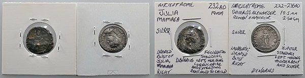 Description: Ancient Rome Imperial Severus Alexander Emperor silver Denarius N/D (222-235 AD) (19mm). Obv: laureate draped bust right, Rev: Jupiter standing left holding thunderbolt and sceptre. Also Julia Mamaea silver Denarius 232 AD. Obv: Draped bust right, Rev: Fecunditas standing left holding cornucopia and extending right hand to child. Latter dark toned. (2 coins total).   aFINE