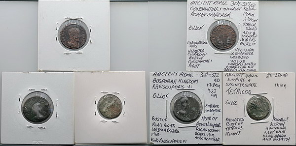 Description: Ancient Rome and Provincial billon silver Constantine I (307-337AD) bust/Vexillum, Bosporan Kingdom Rhescoporus VI (321-322AD) bust/portrait and wreath, Gallic Empire Tetricos (271-274AD) bust/Victory. Dark toned. (3 coins total).   VG-aFINE