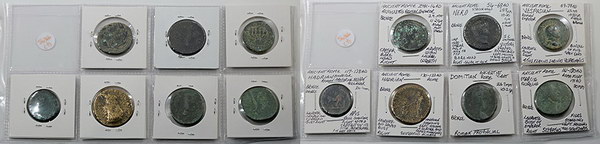 Description: Ancient Rome Imperial bronze: Hadrian (117-138AD) bust/Fortuna (cleaned), Hadrian sestertius (117-138AD) bust/Felictius (cleaned), Faustina/Diana (161-180AD) bust/Felicitas, Commodus (177AD) bust/Aurelius and Commodus, Maximianus (286-310AD) bust/Genius, Galerius Maximian (303AD) bust/Moneta, Gelerius (305-311AD) bust/Moneta and Constanius I (305-306AD) bust/Moneta. (8 coins total).   G-VG