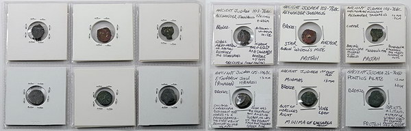 Description: Ancient Judaea Empire bronze prutahs (biblical widows mites): Alexander Jannaeus half prutah (103-76BC) wheel/figure (11mm), prutah (103-76BC) saw/anchor (13mm), purdah fraction (103-76BC) cornucopia/pomegranate (10mm), Ethnarch John Hyranosi (135-104BC) double cornucopia/uncertain (pitted, 13mm), Minimas (c1st C) Hercules/vine leaf (13mm) and Pontius Pilate (26-36AD) lituus/unknown (12mm). (6 coins total).   G-VG