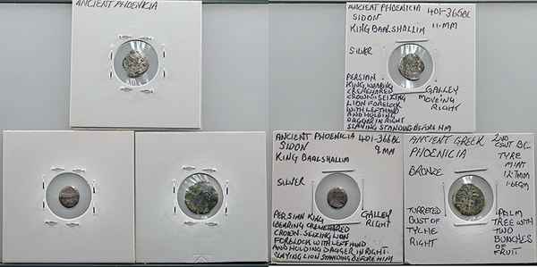 Description: Ancient Phoenicia silver minors: Sidon King Baalshallim (401-365BC) crowned king holding lion/ galley (2 coins;11mm and 9mm) and (c 2nd Cent BC) bust of Tyche/palm tree (13mm). (3 coins total).   VG-aFINE