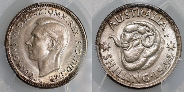 | Description: Shilling. 1944S. PCGS graded MS 65 (49631973). Peripheral tone with frosty mint bloom. GEM UNC |