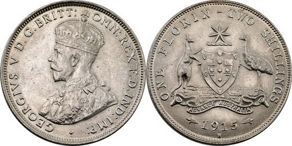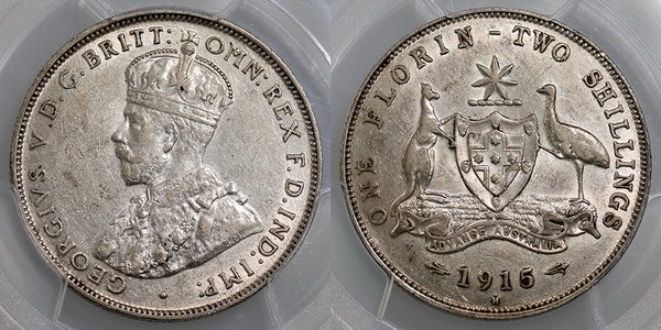 | Description: Florin. 1915H. PCGS graded AU 53 (28478303). Some tone and bloom with surface marks. aEF |