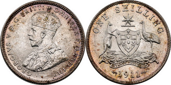 | Description: Shilling. 1911. Light golden peripheral tone with some surface marks. UNC |