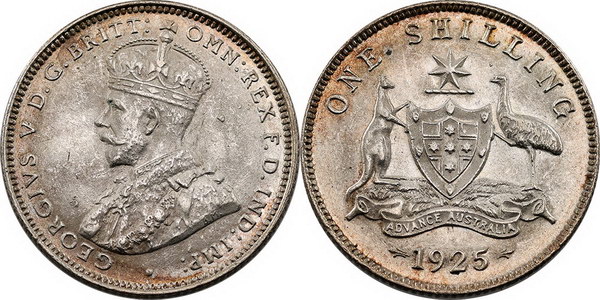 | Description: Shilling. 1925. Light tone, small Obverse cud with surface marks. UNC |