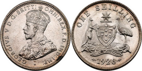 | Description: Shilling. 1926. Light tone with orange peel surfaces. UNC/Ch.UNC |