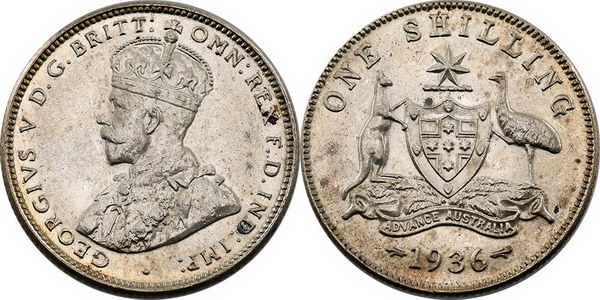 | Description: Shilling. 1936. Light tone with spot. UNC |