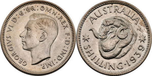 | Description: Shilling. 1939. PCGS graded MS 63 (80784322). Light tone, bright mint bloom to Reverse. Ch.UNC |