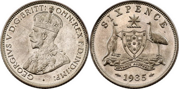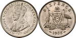 | Description: Sixpence. 1935. Frosty soft old tone, some light Obverse marks. UNC |