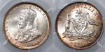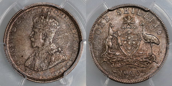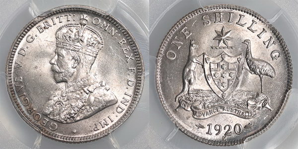| Description: Shilling. 1920M. PCGS graded MS 65 (61267303). Equal second highest graded, with only two graded higher. Light tone with bright mint bloom. Very rare in this grade. GEM UNC |