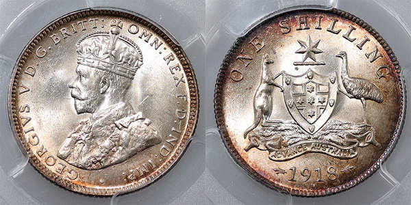 | Description: Shilling. 1918M. PCGS graded MS 64 (24809780). Equal third highest graded, with only 5 graded higher. Peripheral tone with mint bloom. Coin turned in case. Ch.UNC/GEM |