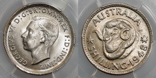 | Description: Shilling. 1948. PCGS graded MS 64 (80784367). Light tone with bloom. Ch.UNC/GEM |