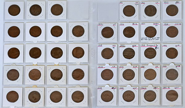 | Description: Penny. 1921, 1922, 1923, 1924, 1926, 1927, 1928, 1929, 1931, 1931 Dropped 1, 1932, 1933, 1934, 1935, 1936, 1938, 1939, 1940, 1941. (19 coins total). F-gVF |