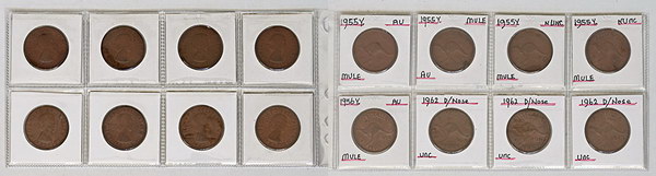| Description: Penny. 1955Y Wide 5 5 type (4), 1956Y, 1962 Double Nose (3). In flips/sheets, each coin in holder and annotated. (8 coins total). EF-aUNC |