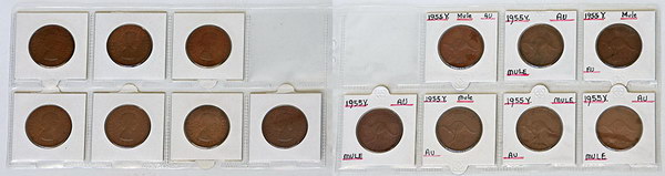 | Description: Penny. 1940, 1940 K.G, 1947Y, 1948Y (2), 1950 long 1 (2), 1951 date doubled, 1951Y, 1959. Minor varieties with tiny cuds/dots, die cracks etc. (10 coins total). F-gEF |