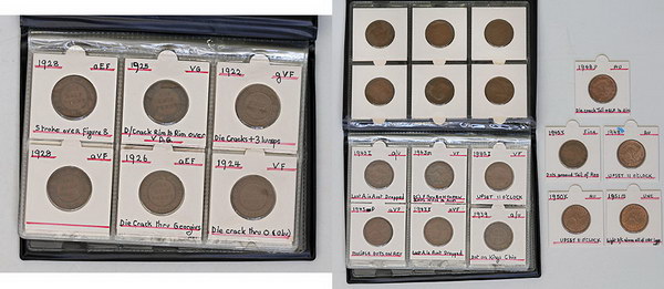 | Description: Penny. 1920 Dot Blow, 1924 Indian Obverse, 1928 broken 8, 1930 date altered forgery, 1931 Dropped 1, 1933/2 overdate, 1941 K.G, 1942Y missing I mintmark. (8 coins total). VG-aVF |