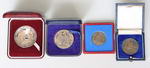 | Description: 1976 Numismatic Society SA Golden Jubilee silver proof-like medallion (45mm/60.26g), 1983 Royal Tour silver Proof gilt bronze medallion (51mm/55.3g), 1969 Apollo 11 1st Footprints on the Moon silver medallion (38mm/28.18g), 1935 GB George V and Mary silver medallion (32mm/15.43g). All cased (no COAs), some marks and coins toned. (4 items total). UNC-FDC |