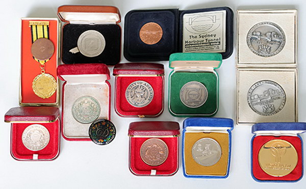 | Description: Assorted Australian commemorative and collector medallions. Includes: 1969 Nickel Coinage (39mm), 1966 Australian Decimal Coins white metal (39mm), copper (39mm), Melbourne Moomba Festival (pewter?) (2; 51mm), 1970 Adelaide Festival of Arts (39mm), 1979 WA 150th Anniversary replica medal on ribbon, 1988 ANZAAS Centenary (38mm), 1984-5 Victoria 150 Years gold-plated (52mm), 1981 HMAS Canberra (40mm), 1992 Sydney Harbour Tunnel opening (32mm). Also 1981 Charles and Di colour-enamelled medallion (38mm) (enamel detached). All cased, some toned and some marks. (12 items total). UNC |