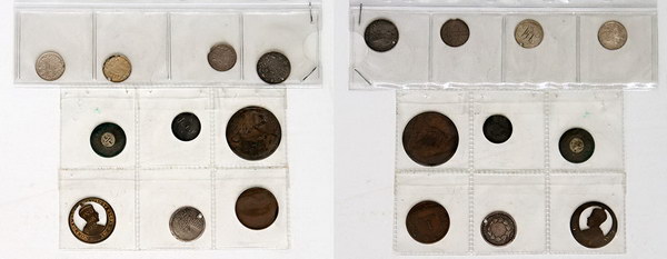 | Description: Love tokens on British silver Threepence 1897 inscribed Frankie on Obverse (damaged), 1898 with initials JH on Obverse (holed), 1881 with initials GHH- 1885 inscribed on Obverse, N/D Victoria Jenny on Reverse, Sixpence 1900 with JAB - Kitty Buchanan - Aug 24 inscribed over Queens Head on Obverse (holed), Penny 1866 engraved Flora Green oer Obverse. Also GB Model Halfpenny Victoria, Australia Halfpenny 1917 with part removed behind portrait, Adelaide International Exhibition 1861 small prayer medallion (holed) and S.A.G Dept Currency copper 1 Mark uniface token. (10 coins total). F-VF |