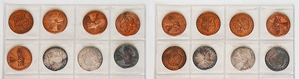 | Description: Bundaberg Numismatic Society for Bundaberg Centenary medallions 1967 (38mm). Struck by Amor; sterling silver (3; 38.4g ea), copper (5; 32.85g ea). Toned. Scarce, only 100 struck in silver and 250 in copper. (8 items total). UNC |