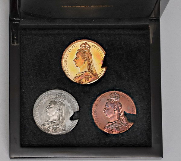 | Description: INA Pattern Collection of Advance Australia Victoria retro fantasy Crowns (1887 dated): struck in gilt cu-ni, white metal and copper. In INA case. Scarce, especially as a set. FDC |