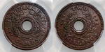 | Description: Two Shillings copper WW II Internment Camp token. PCGS graded Genuine - Environmental Damage - AU DETAIL (49193719). Light pitting but good details, dark toned. gVF |