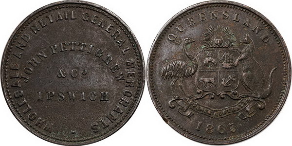 | Description: Penny. Pettigrew, John copper Penny Token 1865. Ipswich Qld (A438/R428). Rarity 2. gVF |