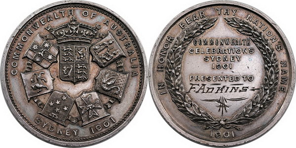 | Description: 1901 Commonwealth of Australia Celebrations, Sydney silver Prize medal (38mm, 61.8g). Awarded to F. Adkins, inscribed on edge -CADET COMMONWEALTH RIFLE MEETING-. Struck by Llewellin and Co Jewellers Sydney. Attractive old gunmetal-grey patina. Ex John Chapman collection, Nobles Aug 2013 S103 (lot 1053). gEF |
