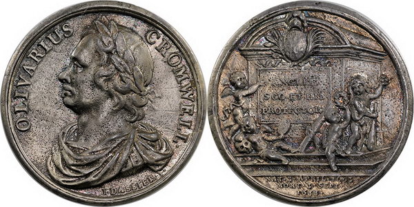 | Description: British Oliver Cromwell silver memorial medal (dated 1668) (20.65g). Deep old gunnmetal toned, surface a little pitted. Struck in 1731 by Jean Dassier, from his Kings and Queens of England series. gVF |