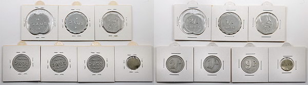 | Description: Royal Queensland Youth Club (RQYC) set of 7 aluminium tokens, some with unusual scalloped edges. With article. (7 items total). UNC |