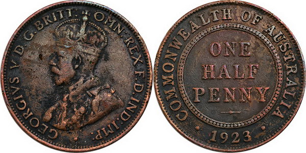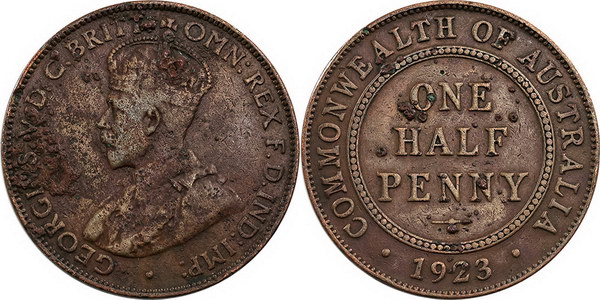 | Description: Halfpenny. 1923. Key date. Some corrosion and adhesions, scratches, edge knocks and slight pitting. VG |