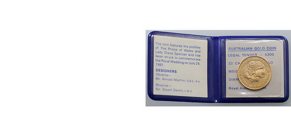 | Description: Two Hundred Dollars. 1981 Charles and Di Royal Wedding gold Unc 200 Dollar (10g/22ct). In vinyl RAM pack of issue. UNC |