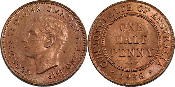 | Description: Halfpenny. 1938. Minor Reverse edge clip under date. Mint red. Ch.UNC/GEM |
