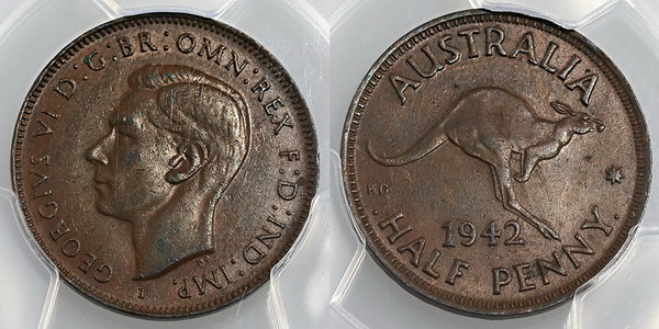 | Description: Halfpenny. 1942I. Long Reverse denticles. PCGS graded AU 55 (84717577). Brown. gEF/aUNC |