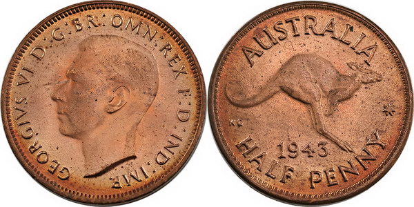 | Description: Halfpenny. 1943. Mint red with a hint of peripheral tone. Ch.UNC/GEM |