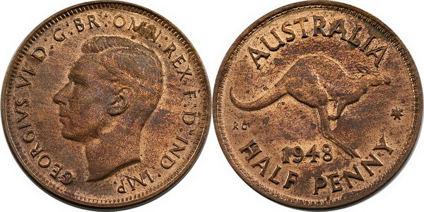 | Description: Halfpenny. 1948. Red and brown with bright lustre. Ch.UNC |