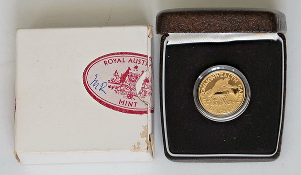 | Description: Two Hundred Dollars. 1982 Brisbane Commonwealth Games gold Proof 200 Dollar (10g/22ct). In RAM case of issue with COA and outer box (a few marks to box). FDC |