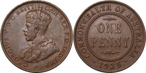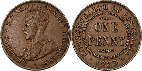 | Description: Penny. 1925 English Obverse. Key date. Brown with six pearls and part centre diamond. aVF |