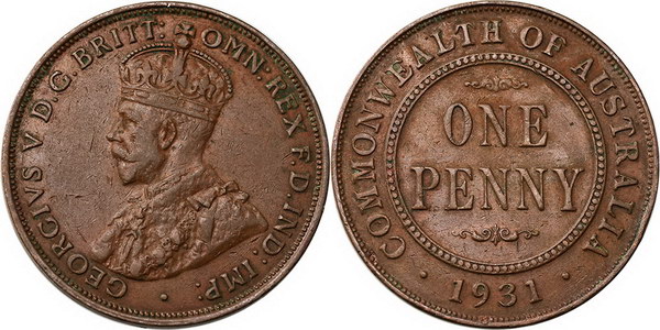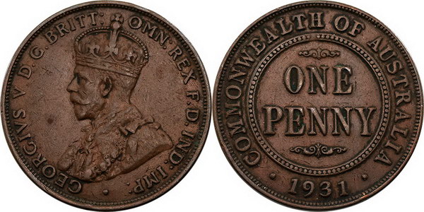 | Description: Penny. 1931 Dropped 1. English Obverse. Brown, six pearls and hint of centre diamond. aVF/VF |