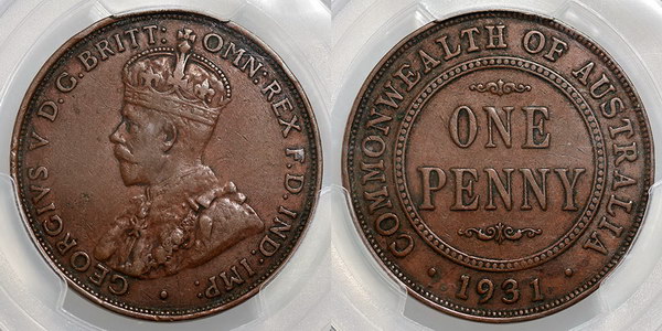 | Description: Penny. 1931 Dropped 1. English Obverse. PCGS graded XF 40 (42900995). Brown with six pearls and part centre diamond. gVF/aEF |
