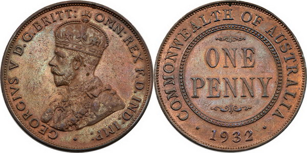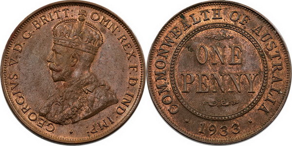 | Description: Penny. 1933/2 overdate. Brown, six pearls and hint of centre diamond. VF |