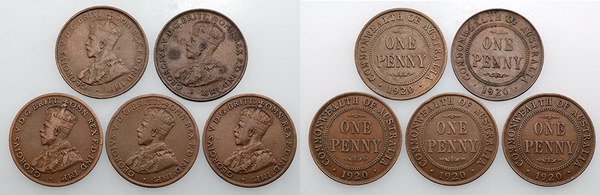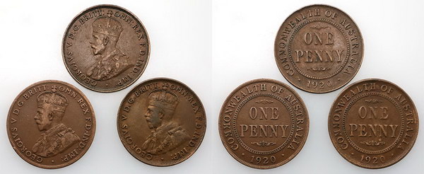 | Description: Penny. 1920 Plain, English Obverse (3), 1920 Dot Below Bottom scroll (3). Scarce. (6 coins total). VG-FINE |