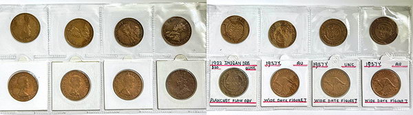 | Description: Penny. 1920 Plain (2), 1920 Dot Below bottom scroll (2), 1922 Indian Obverse, 1957Y Wide date (3). (8 coins total). VG-gFINE |