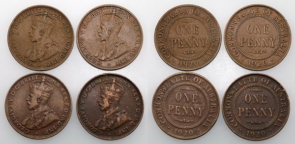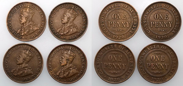 | Description: Penny. 1920 Plain, Indian Obverse (2), English Obverse (2). Scarce. (4 coins total). VG-FINE |