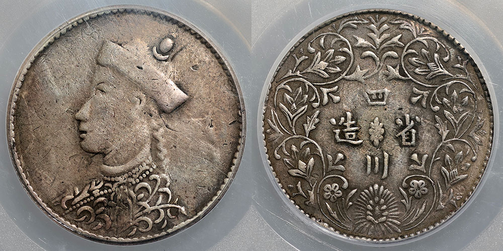 | Description: Tibet (China) silver Szechuan Half Rupee N/D (1904-12). GBCA graded VF 06. Guangxu, small bust with collar and vertical rosette. Toned, weakly struck Obverse. Scarce type, only 130,000 minted. gFINE |