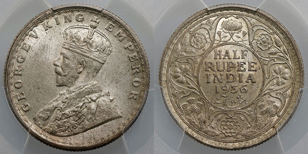 India (British) Half Rupee 1936C. PCGS graded MS 64 (43477343). George V. Some tone with bloom.