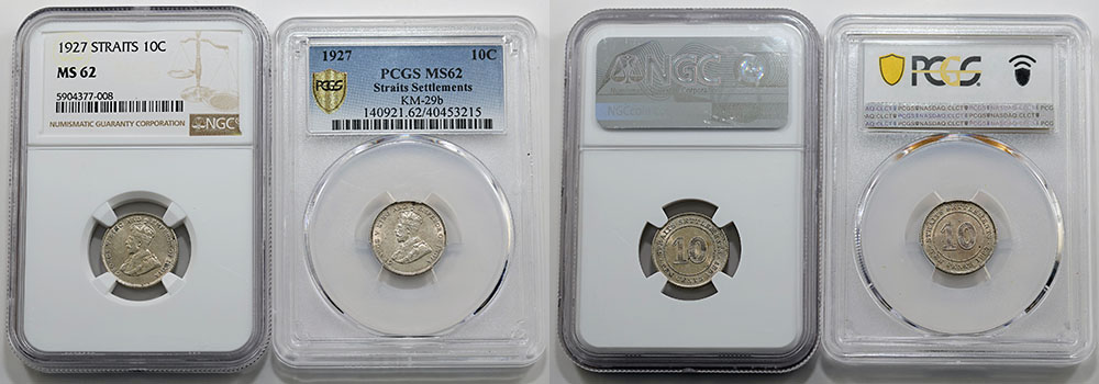 Straits Settlements 10 Cents 1927 (2). One PCGS graded MS 62 (40453215) and the other NGC MS 62 (5904377-008). George V. (2 coins total).