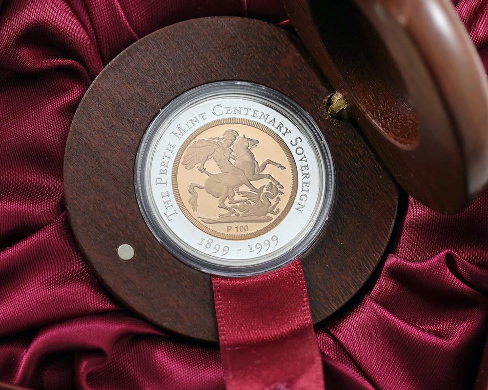 | Description: 1999 Centenary of the Perth Sovereign Bi-metal gold/silver Proof coin. With 22ct gold centrepiece with the same specifications as a Sovereign plus 99.9 silver outer ring. In box of issue with certificate (some light marks to outer case). FDC |