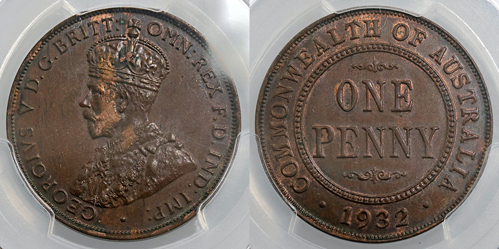 1932. PCGS graded MS 62 BN (83953066). Mostly brown with some patchy mint red.