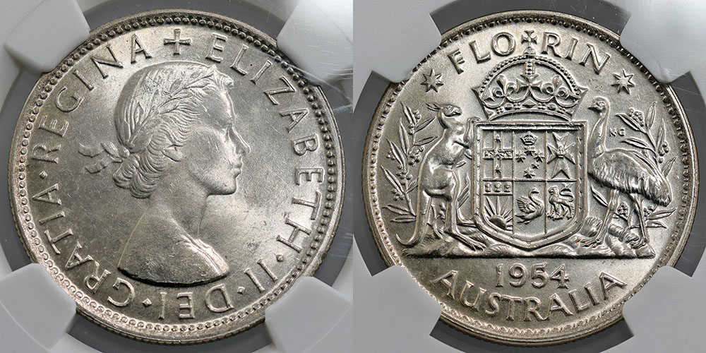 Florin. 1954 Royal Visit. PCGS graded MS 65...